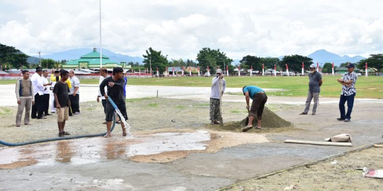 Pantauan di lapangan, nampak orang nomor satu di daerah itu mengawal terus pekerjaan pengecoran dari sisi kanan panggung sampai belakang panggung utama lapangan proklamasi dari pagi sampai sore hari. Segala kekurangan berupa pasir, semen, kerikil hingga air langsung diantisipasi, sehingga pengecoran tersebut berjalan terus.