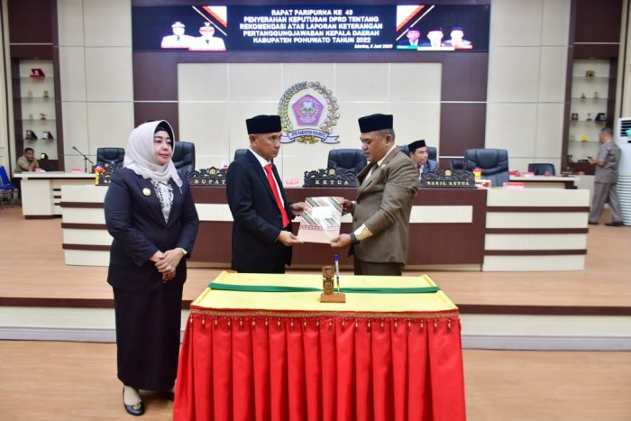 Century.co.id, (Pohuwato) – Bupati Pohuwato, Saipul A. Mbuinga bersama Wakil Bupati, Suharsi Igirisa menghadiri rapat paripurna ke-48 penyerahan keputusan DPRD tentang rekomendasi atas laporan keterangan pertanggung jawaban kepala daerah Kabupaten Pohuwato tahun 2022.