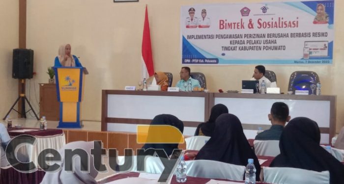 Century.co.id, (Pohuwato) – Bimtek & Sosialisasi Implementasi Pengawasan Perizinan Berusaha Berbasis Resiko Kepada Pelaku Usaha Tingkat Kabupaten Pohuwato, yang bertempat di Aula Hotel Sunrise, kamis (07/12/2023).